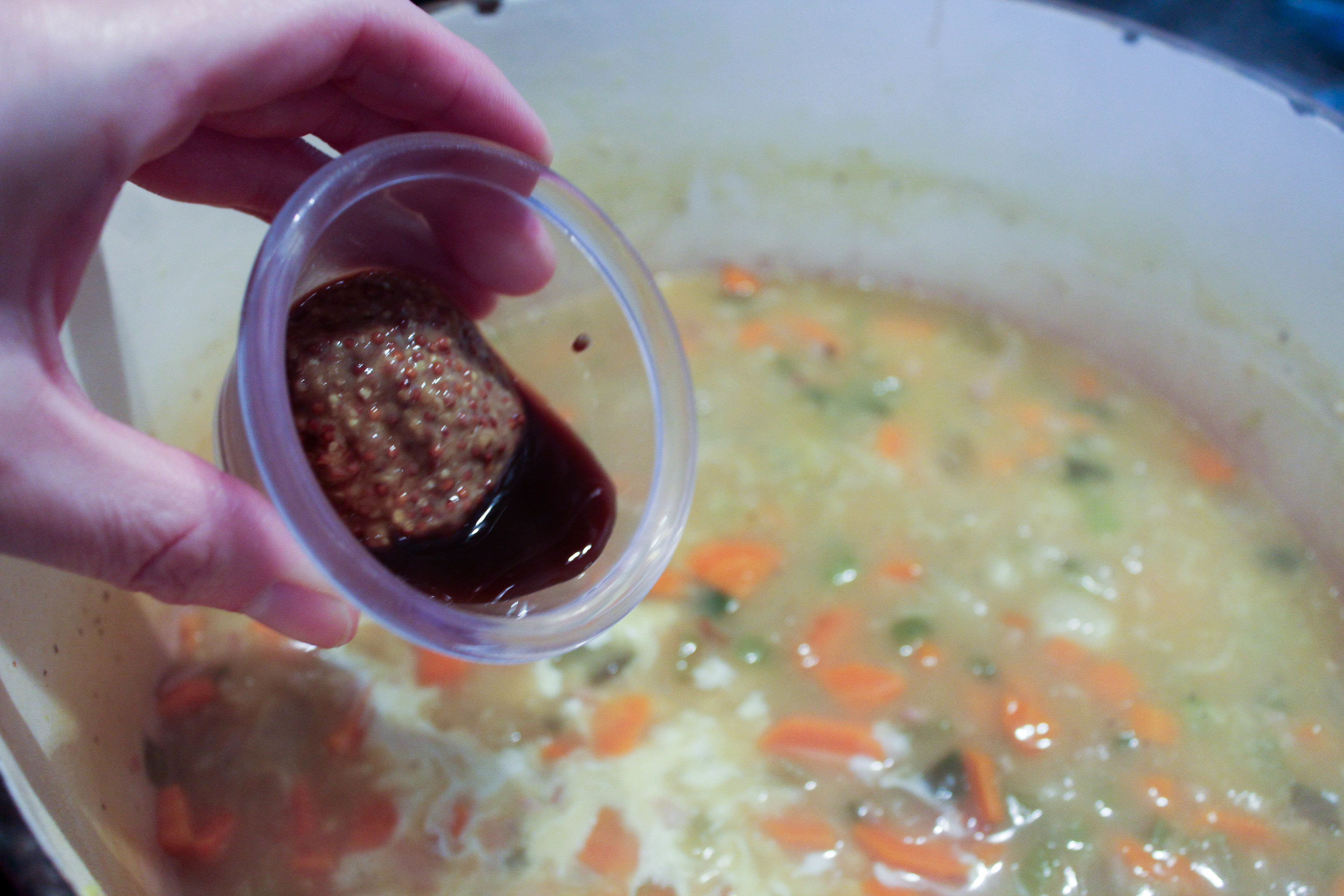 Adding the Worcestershire sauce to the soup.