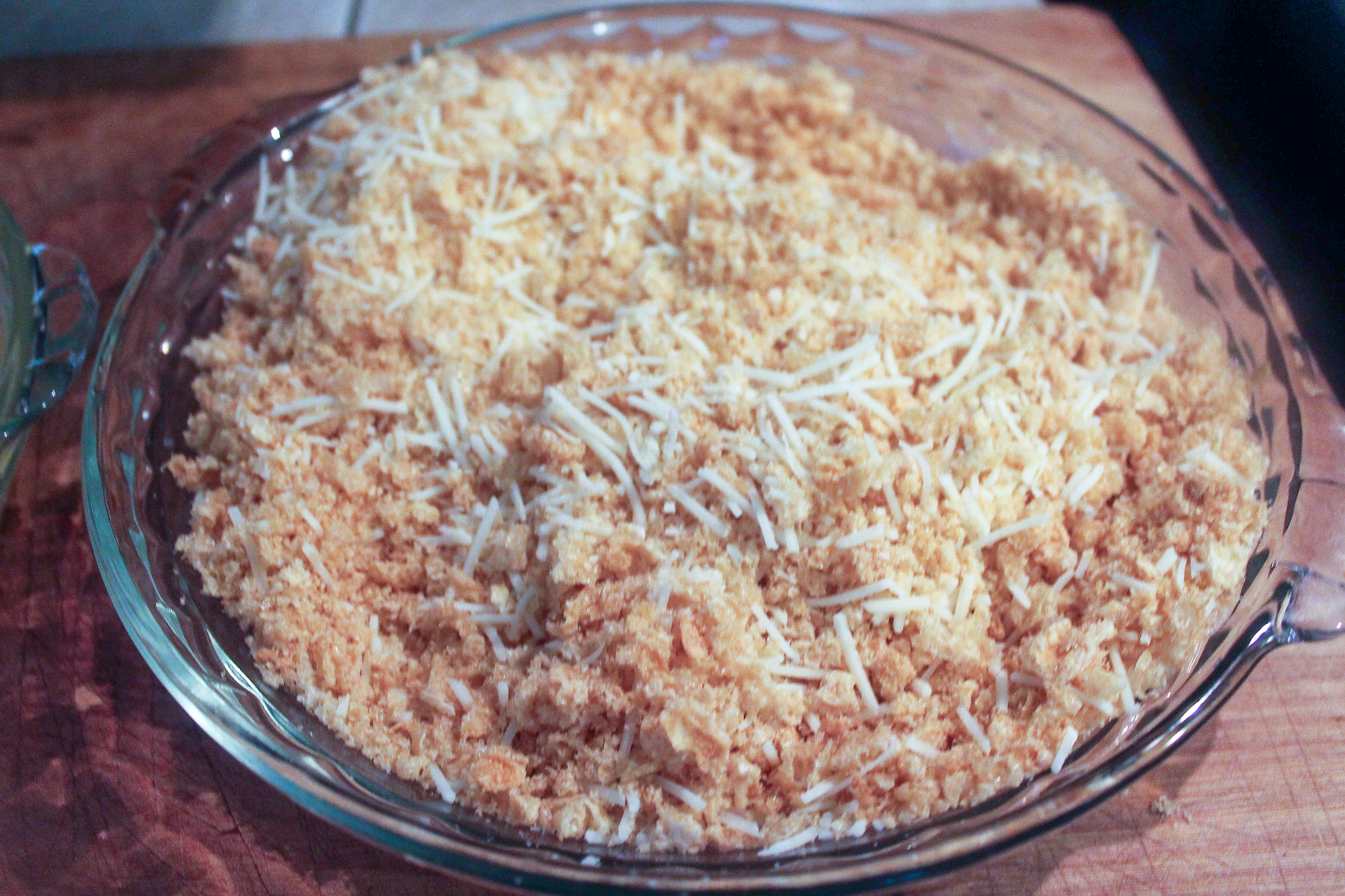 Crushed pork rinds and Parmesan cheese in a bowl.
