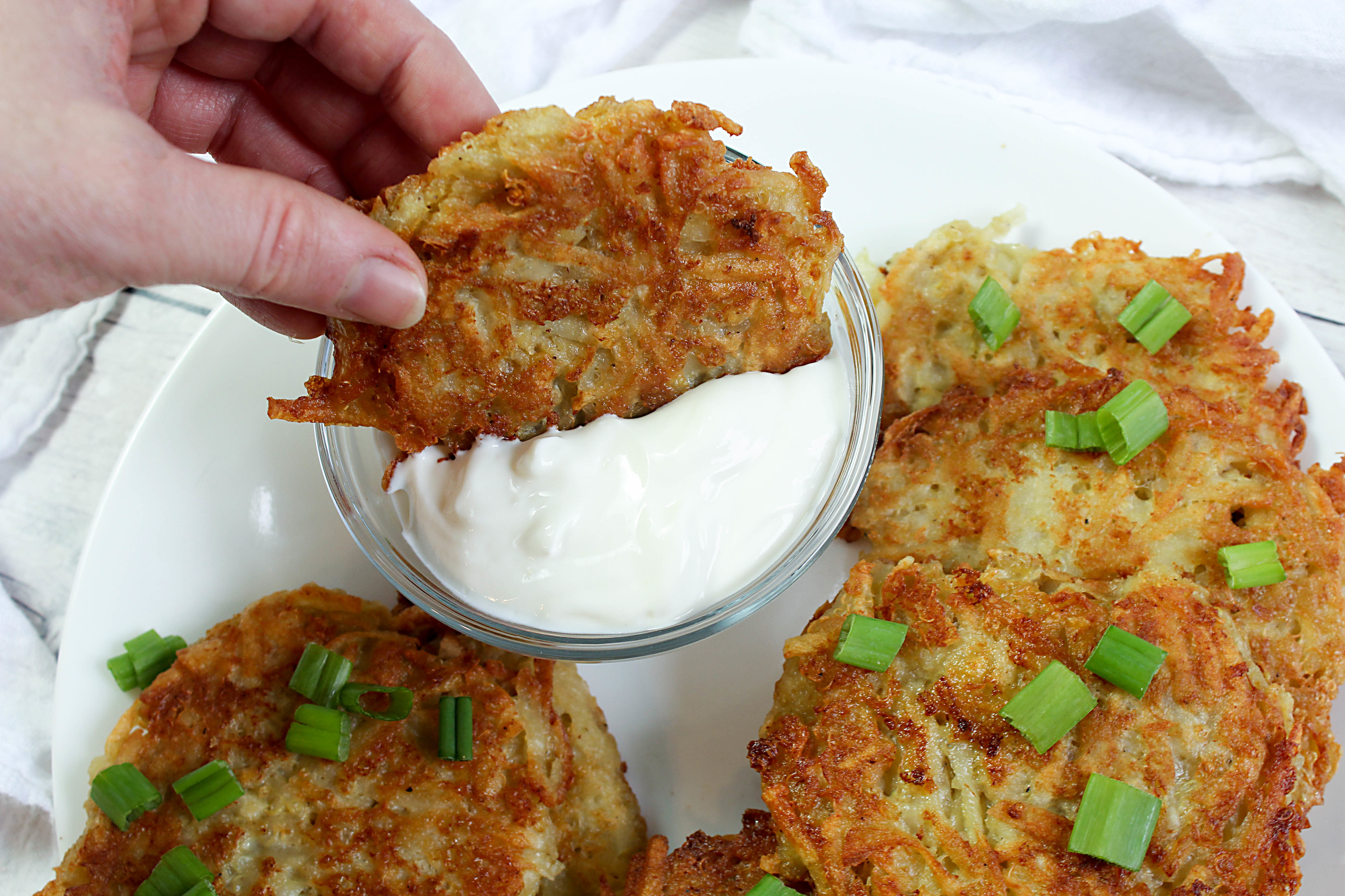 Dipping latkes in sour cream.