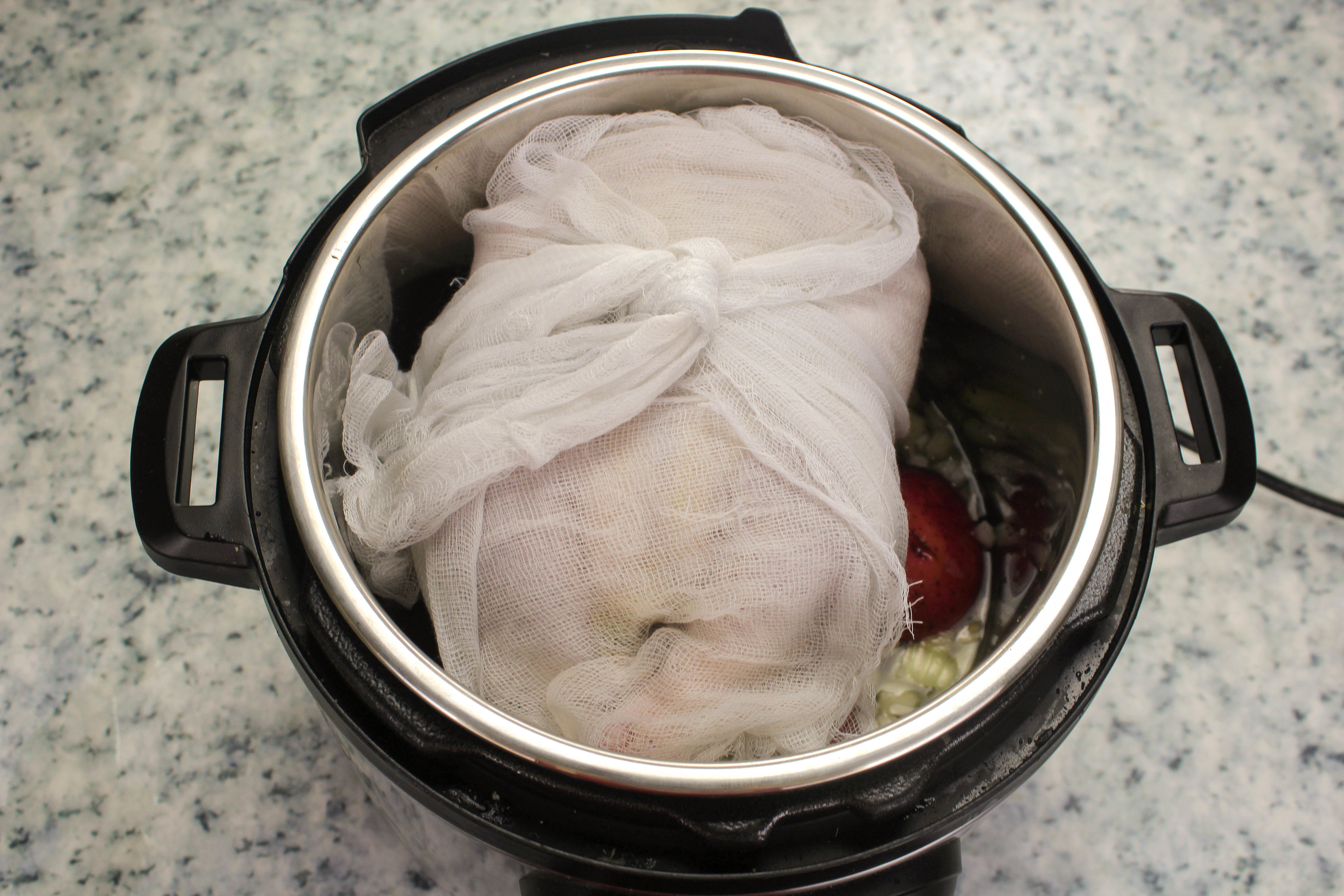 Stuffed chicken on top of the potatoes in pressure cooker.