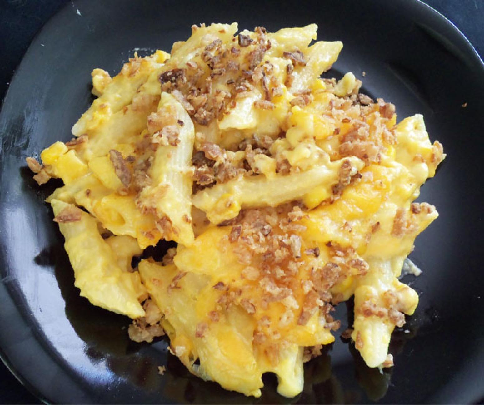 Mac & Cheese w/ French Fried Onions, Corn, & Bacon