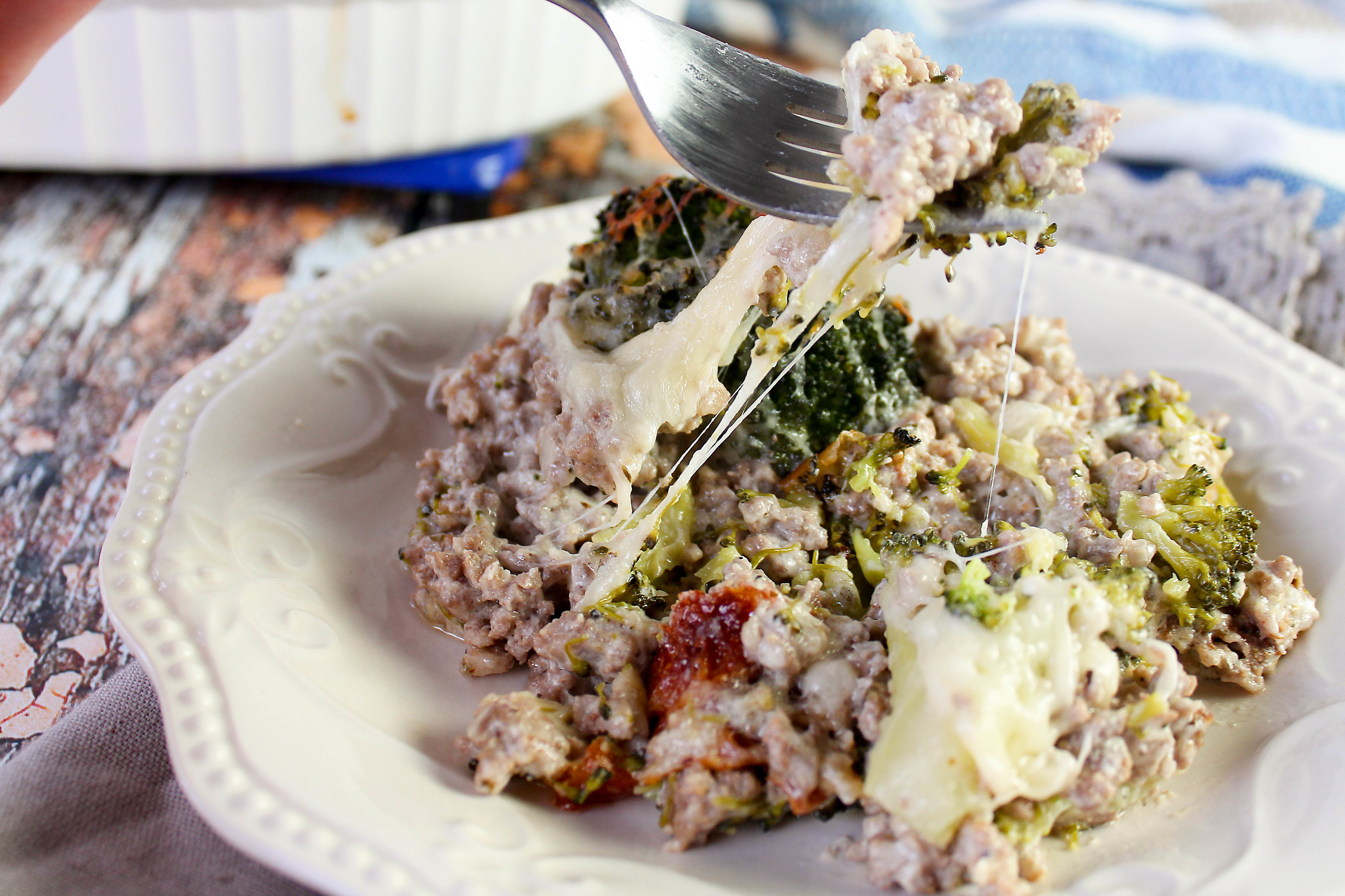 Hamburger, sausage, broccoli Alfredo casserole with melted gooey cheese.