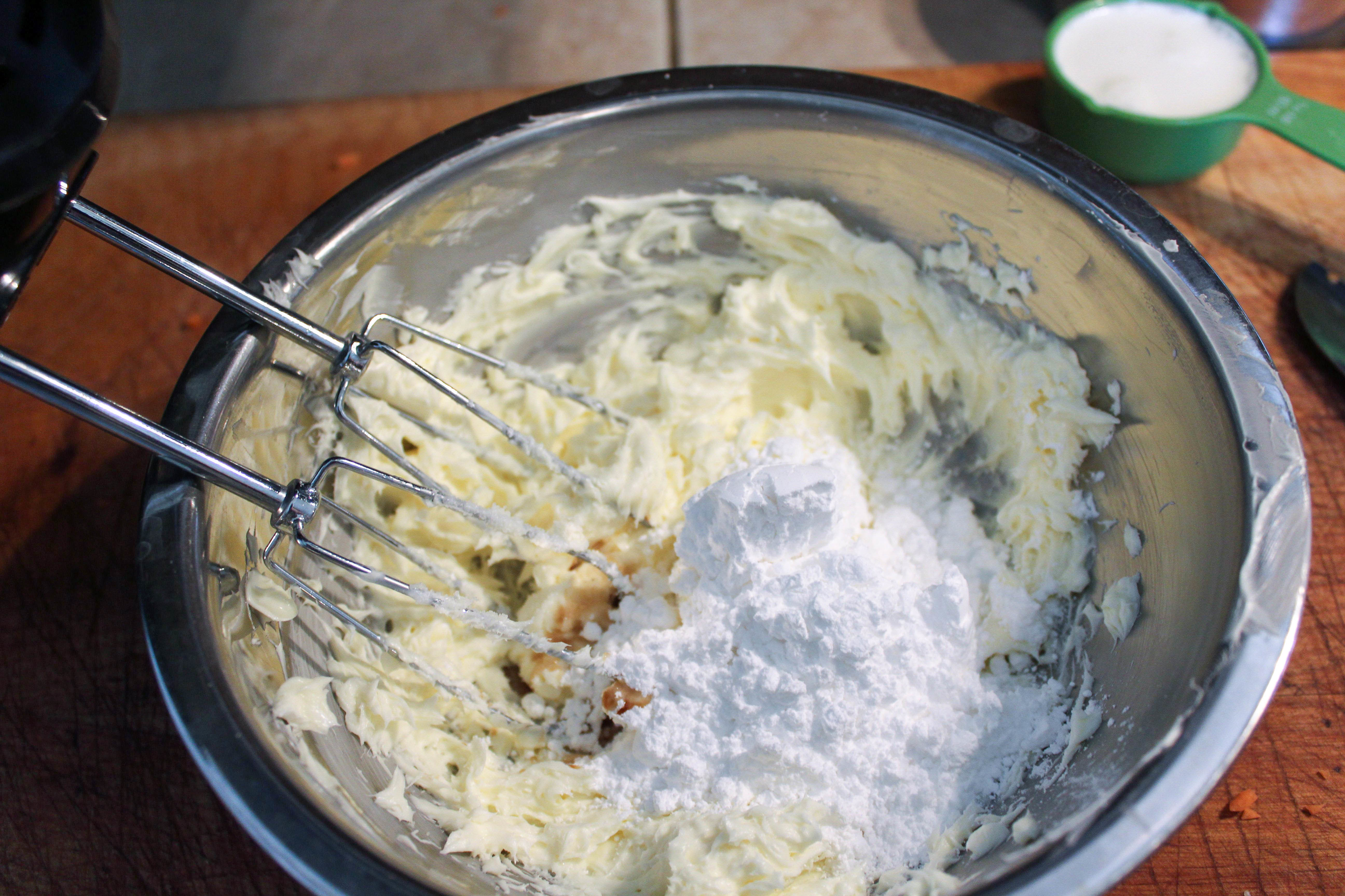 Adding In Powdered Sugar, Milk, Vanilla, And Salt To Cream Cheese/butter Mixture.