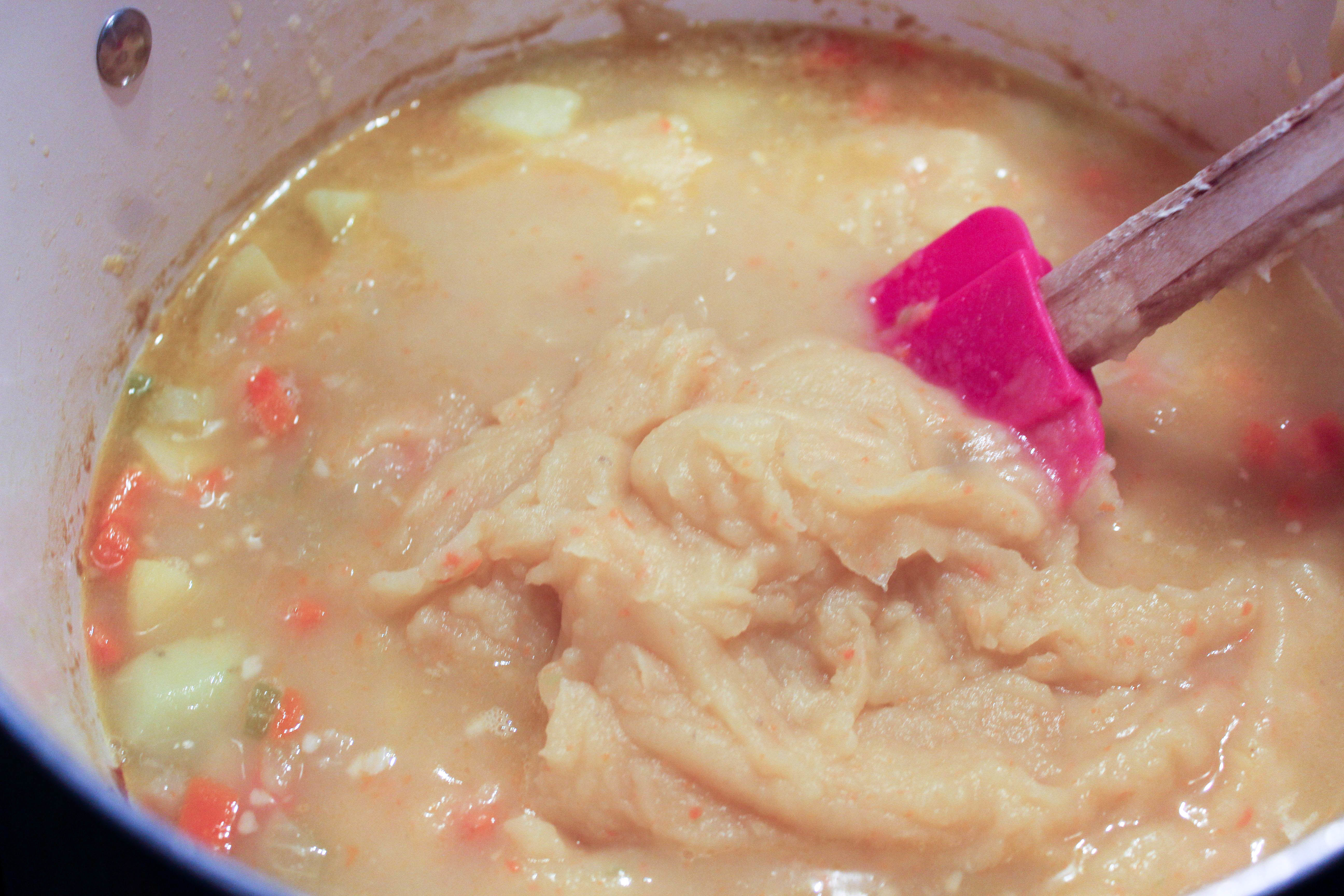 Stirring mixture into soup.
