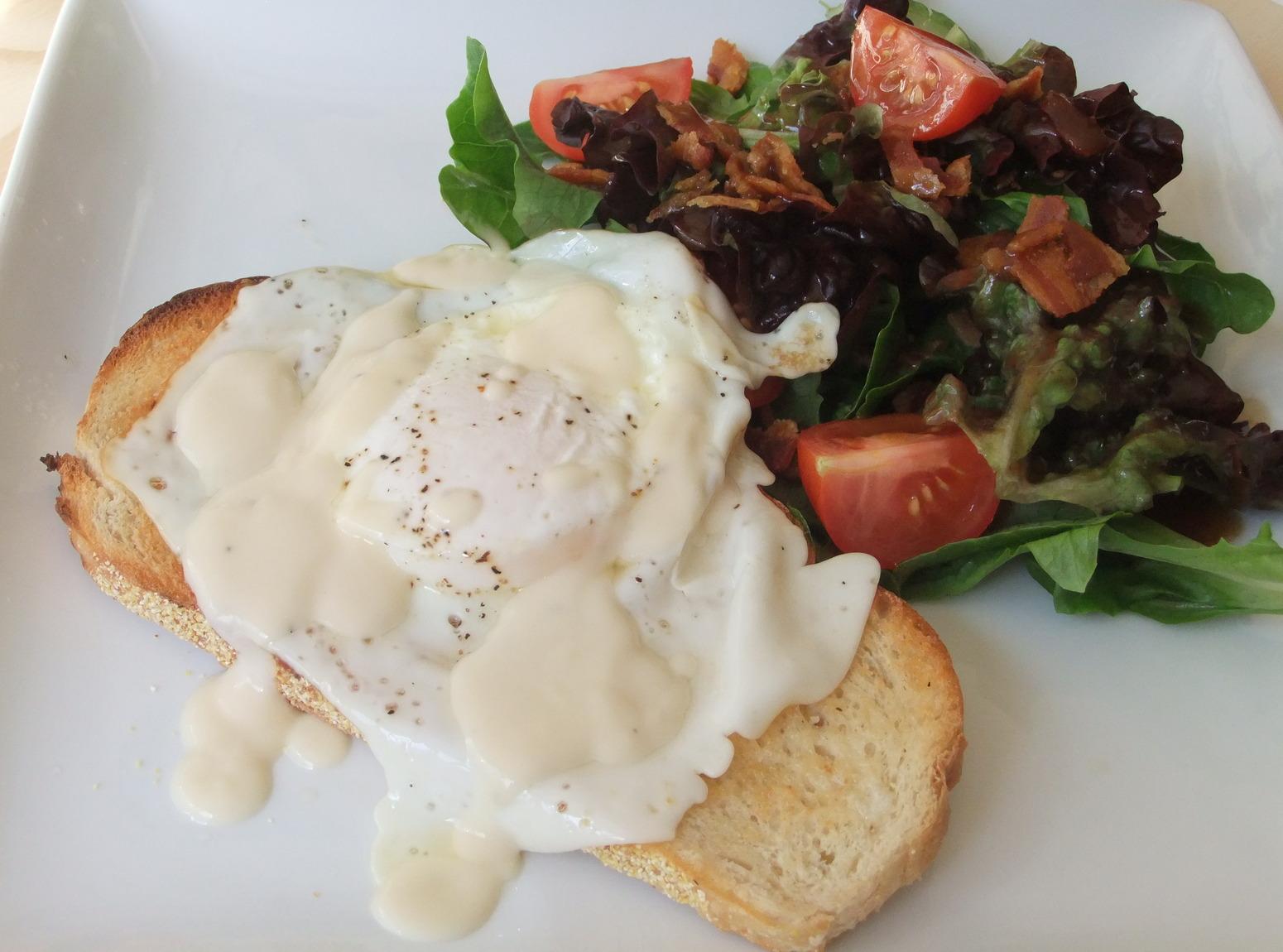 Photos of Alfredo Egg & Garlic Crostini with Baby Romaine Salad and Bacon Vinaigrette
