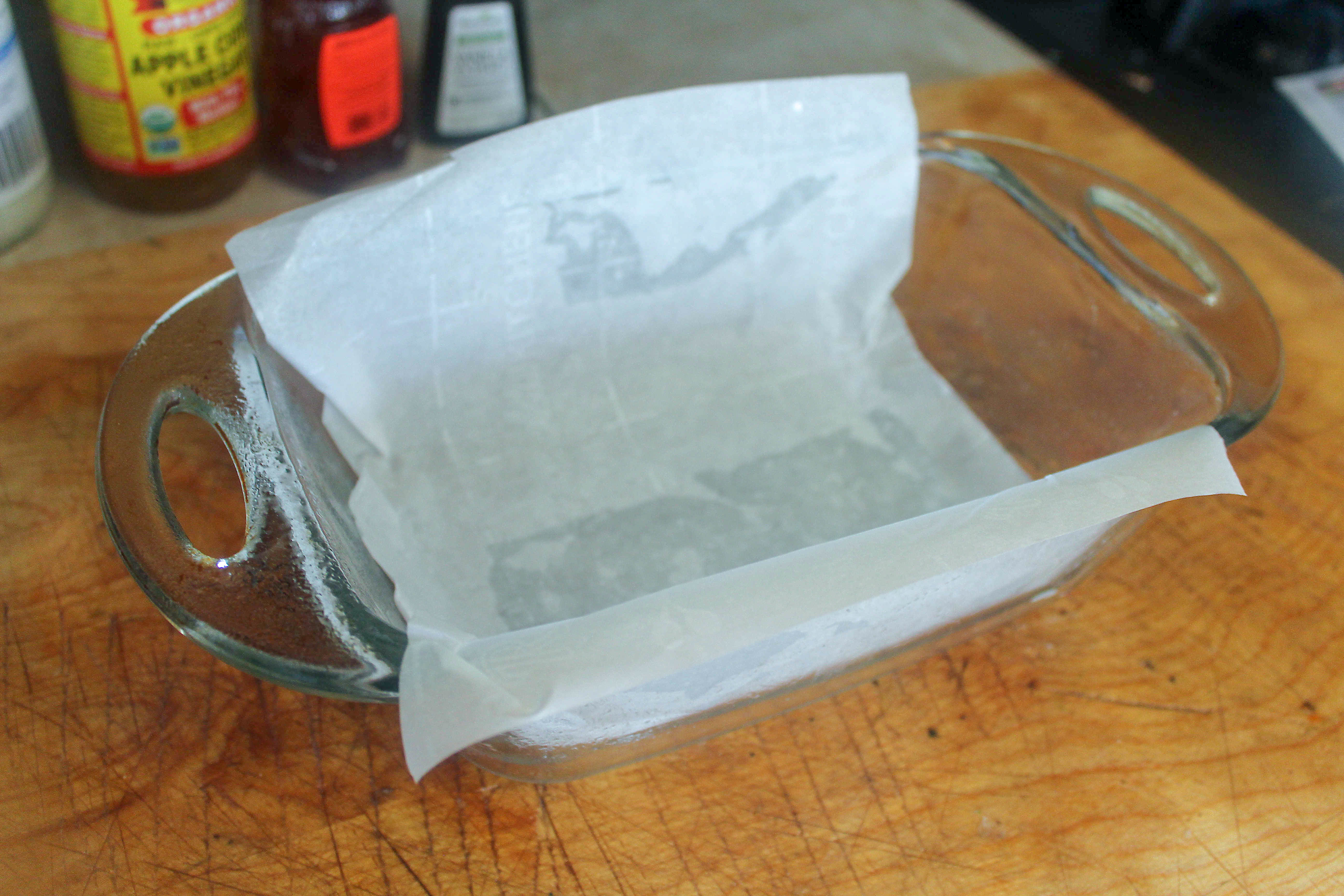 Parchment paper lining a loaf pan.