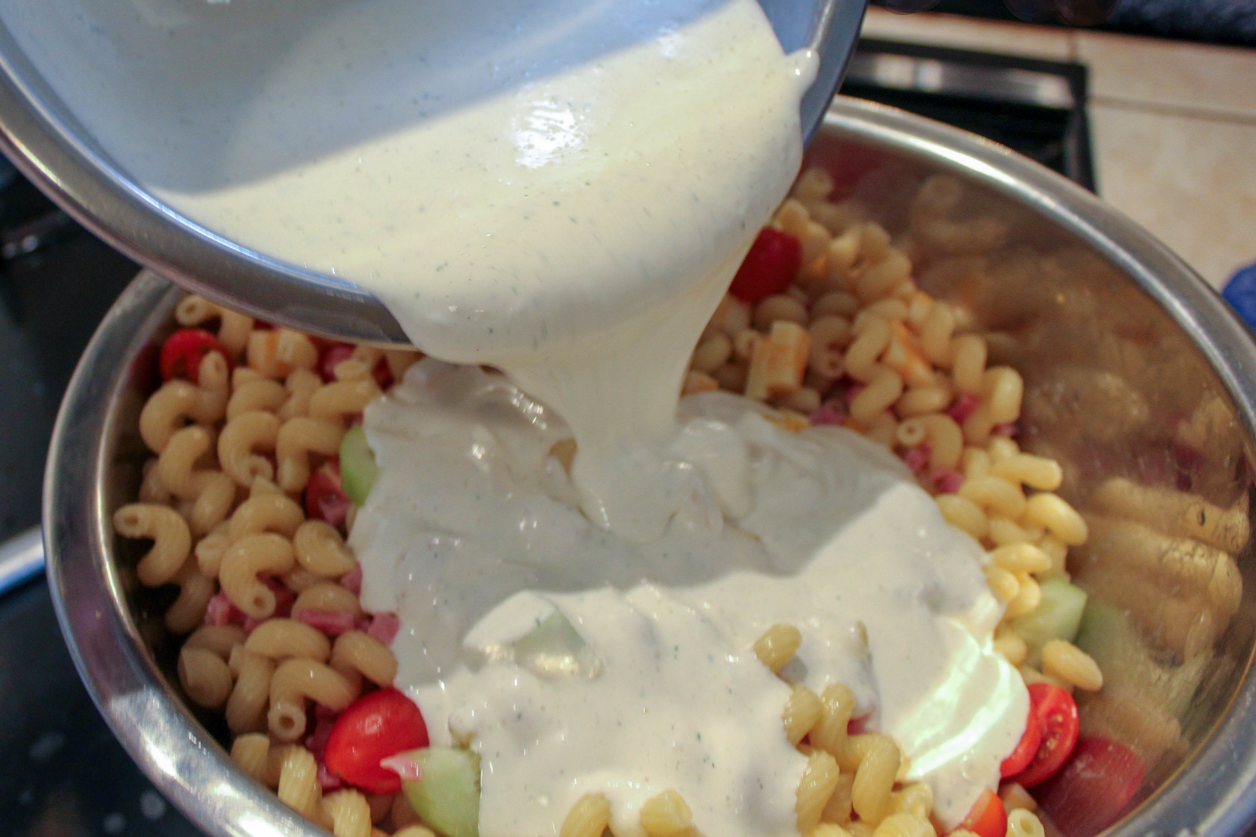 Pouring the dressing over pasta salad ingredients.