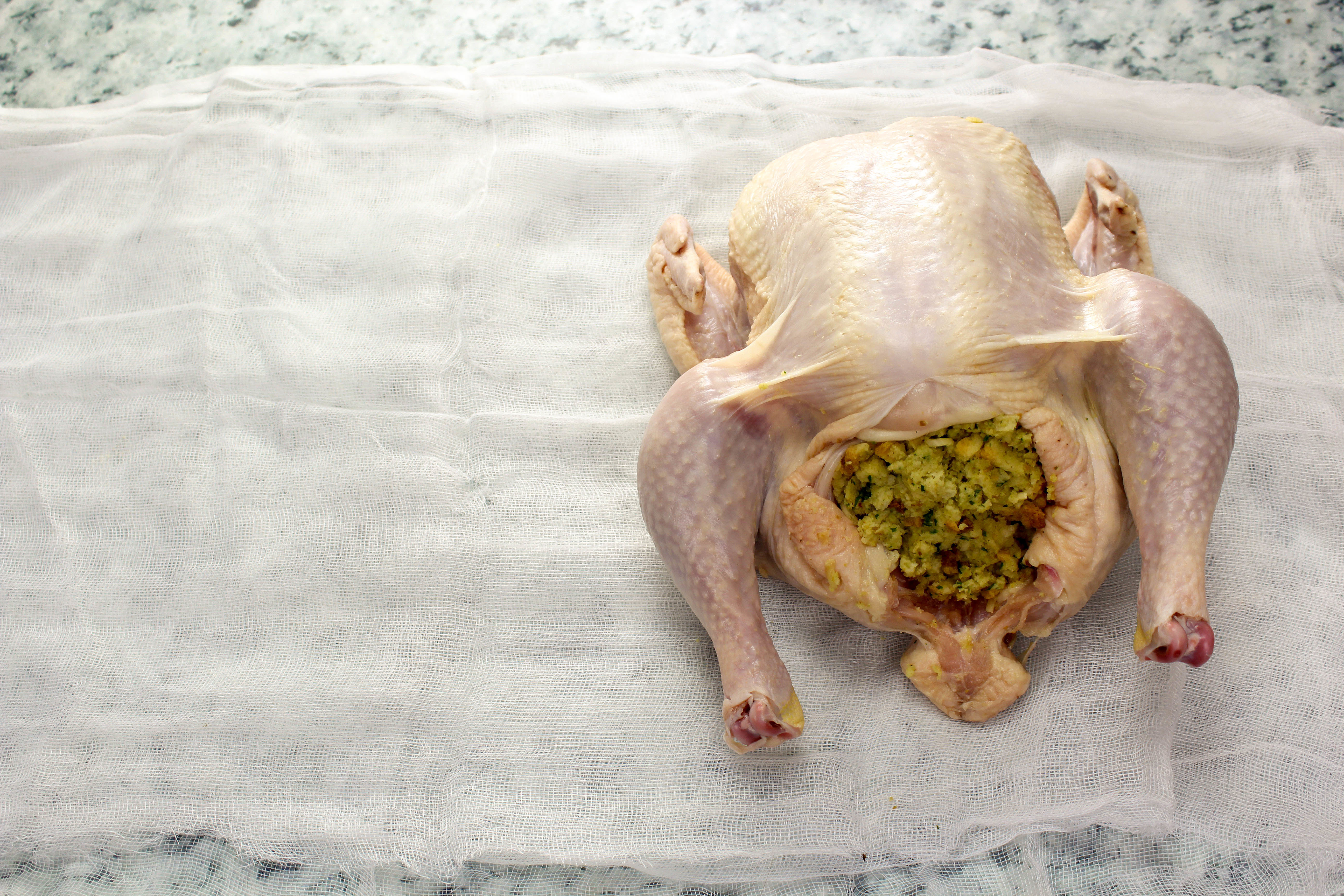 Stuffed chicken on the cheesecloth.