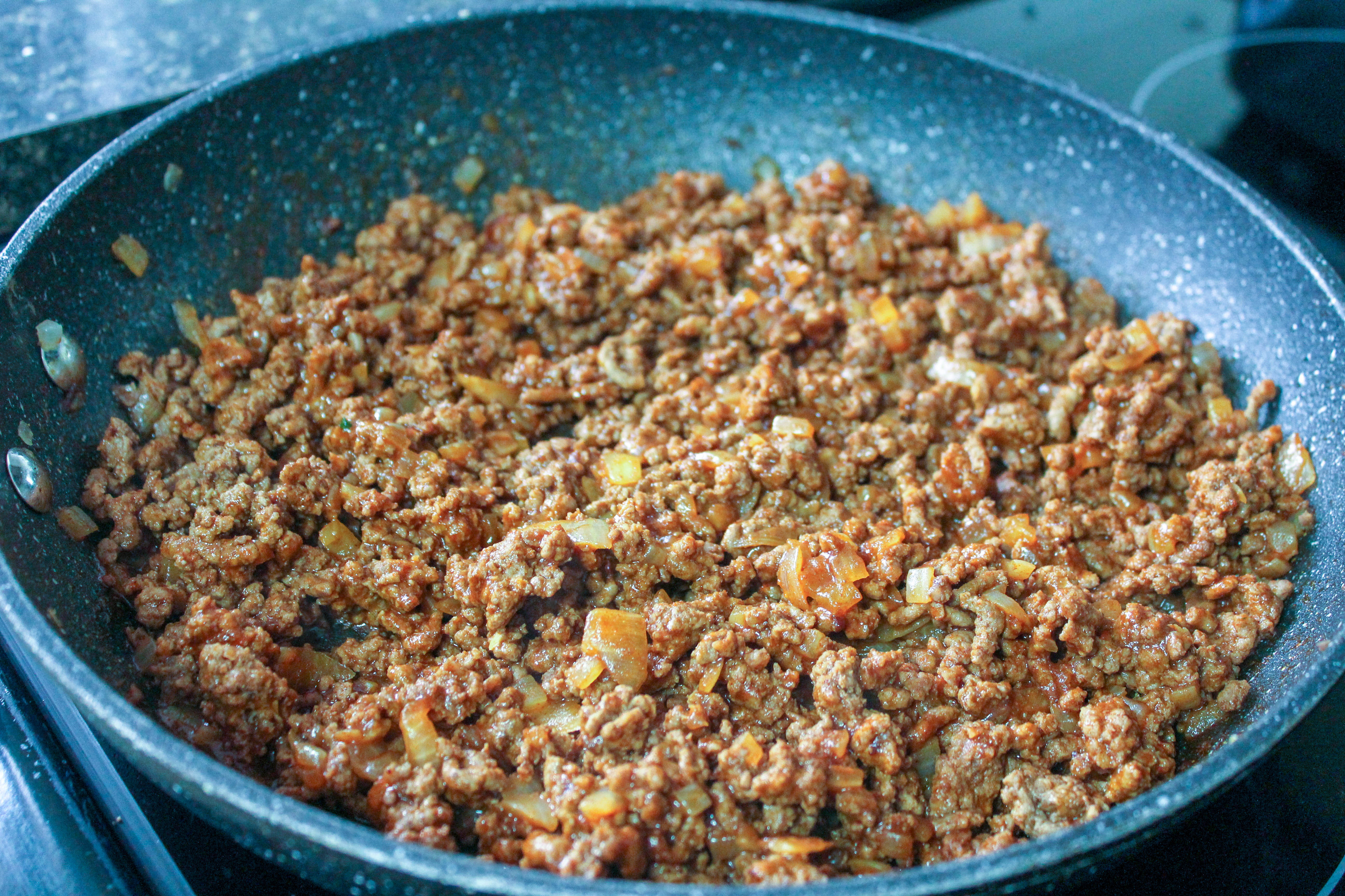 Browning hamburger meat and onions.
