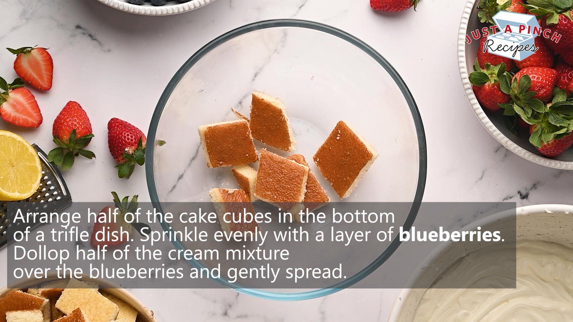 Layers of angel food cake, blueberries, strawberries and whipped cream cheese, Macrayla's Patriotic Berry Trifle is your new go-to easy summer dessert!